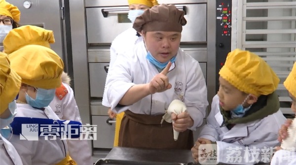 换上厨师服,戴上口罩,十多位南京小学生走进面包坊的制作间,上起了一堂特殊的爱心烘焙课。这位正神情专注指导小朋友的“大厨”,是一位“喜憨儿”,名叫周健,虽然口齿不清,但上起课来却一丝不苟,也让孩子们享受了制作美食的过程。