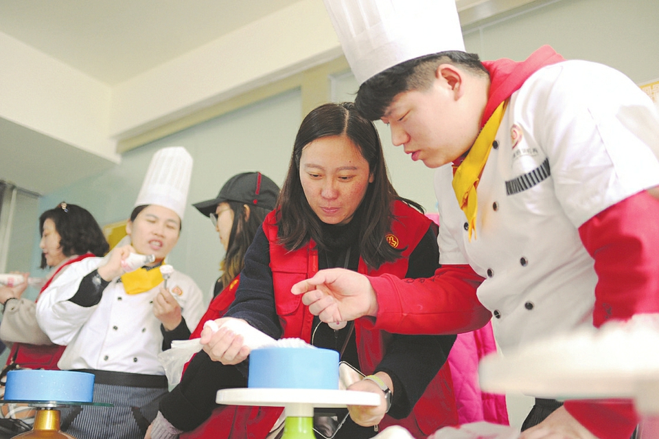 3月1日,社区居民正在专业面点师指导下为蛋糕裱花。太原市青年路一社区在辖区举办烘焙知识讲座和蛋糕裱花活动,通过活动提高了辖区妇女品质生活的技能,增进了邻里之间的情感交流。